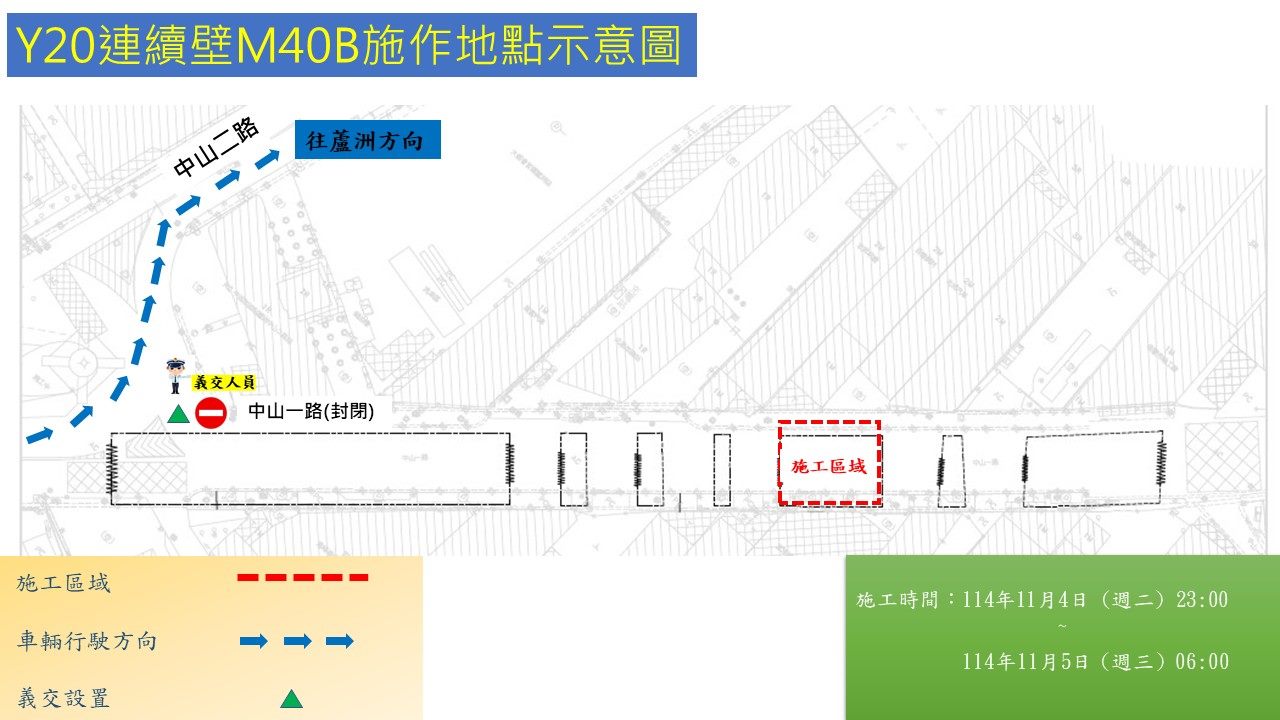 為配合捷運北環段CF680A區段標工程施作站體南側連續壁工程,施工單位將於114年11月4日23時起迄11月5日上午6時止,將封閉蘆洲區中山一路415號(消防局前)至中山一路339巷口止之單行道,俾進行車站站體連續壁M40B單元搭接鋼筋籠作業,施工因吊車占據車道,為維護大眾安全,屆時將封閉中山一路單行車道路段,所有車輛均請改行駛中山二路進入蘆洲市區,本工程施作當日若遇豪大雨則順延至次日施工,相關本次影響行車動線範圍,如附圖所示。 施工期間請用路人配合改道通行,如行經施工區域請減速慢行,並請遵循相關導引標誌、標線及現場指揮人員導引減速慢行,民眾如有任何問題以及建議事項,或想瞭解最新施工動態,可隨時利用下列聯絡電話反映,將有專人竭誠為您服務與解說,施工造成暫時不便,敬請見諒。