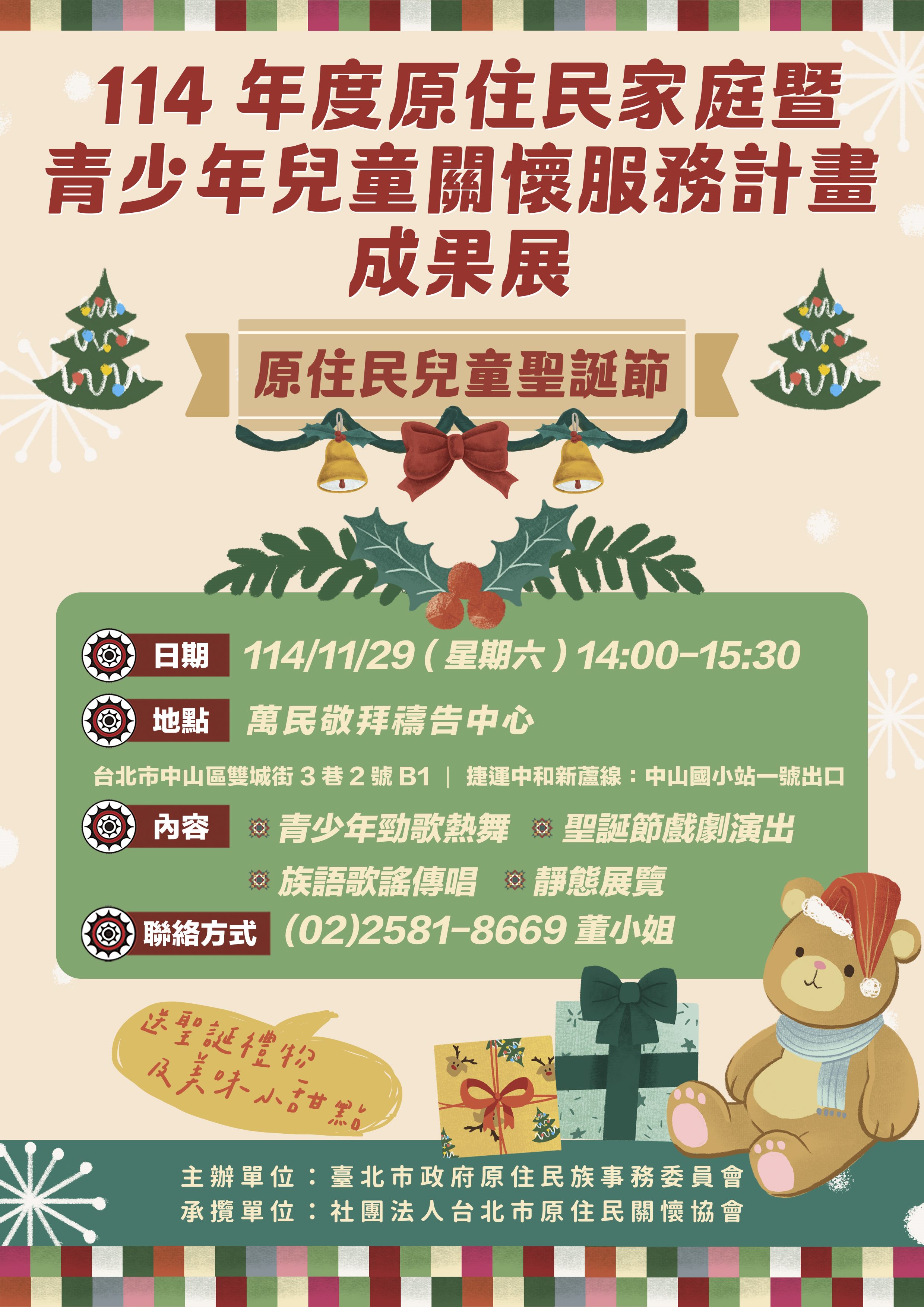 臺北市政府原住民族事務委員會將於11月29日(星期六)在臺北市萬民敬拜禱告中心舉辦「114年度臺北市原住民家庭暨青少年兒童關懷服務成果展」。活動內容包含勁歌熱舞、樂團演出、族語歌謠傳唱、戲劇表演及靜態作品展示,全面展現孩子們一年來的學習成果與生命成長。現場也將特別表揚表現優異的學生,肯定他們在學業、才藝與品格上的努力與突破,見證孩子們在課後照顧陪伴下的茁壯與自信。
