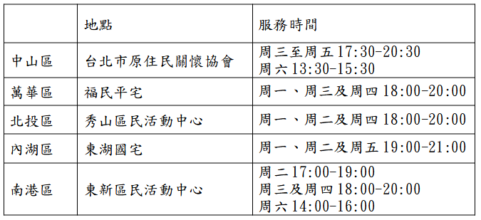 ●各區課後照顧關懷據點服務時間如下: 參加對象為原住民國小至國中學生,有需求的家庭可以洽協會(02-25818669史小姐、黃先生)報名。
