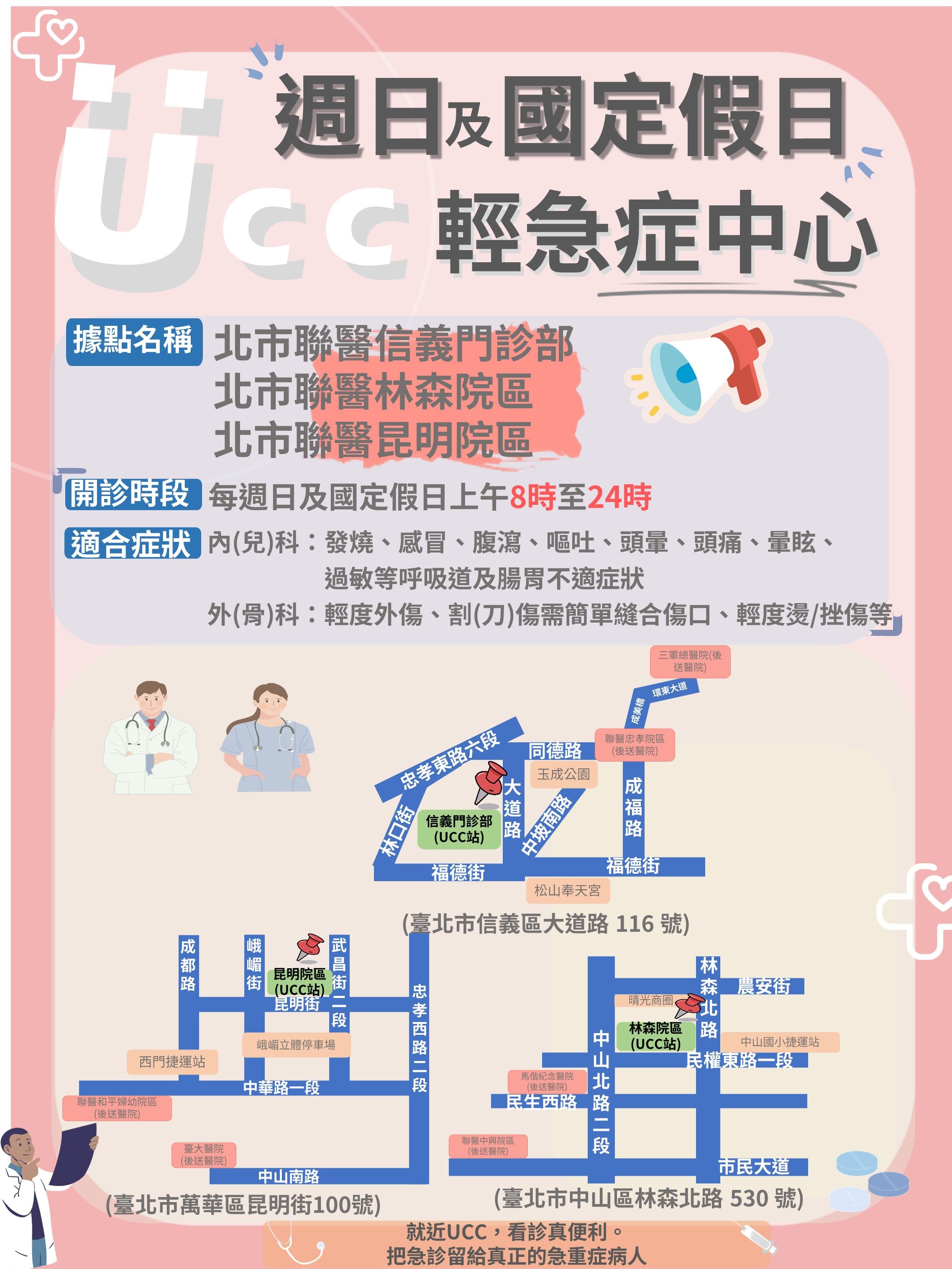 本市配合衛生福利部全民健康保險署辦理週日及國定假日輕急症中心(UCC),自114年11月2日起已於本市聯合醫院廣慈信義門診部(信義區)、聯合醫院林森院區(中山區)及聯合醫院昆明院區(萬華區)等3處設置開辦,提供民眾假日遇有小病、小傷時便利、省時的就醫選擇。
