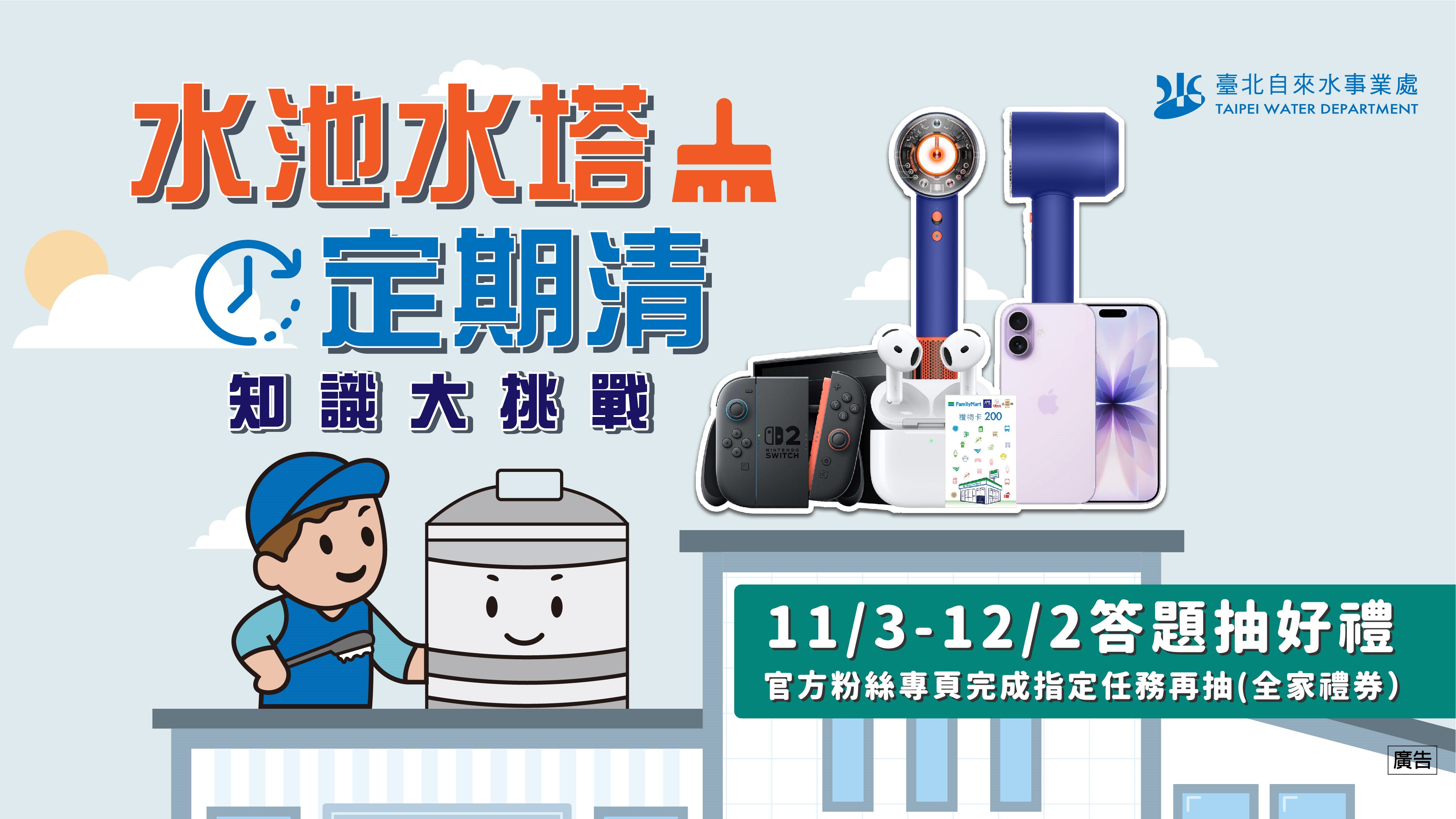 臺北自來水事業處於即日起至12/2舉辦「水池水塔定期清知識大挑戰」抽獎活動,只要在活動頁面答對5個清洗水池水塔知識問題,就有機會抽中iPhone 17、Dyson吹風機、Switch 2、AirPods 4等超大好禮,還有加碼活動再抽超商禮券,讓我們一起水池水塔定期清、維持優良水質!