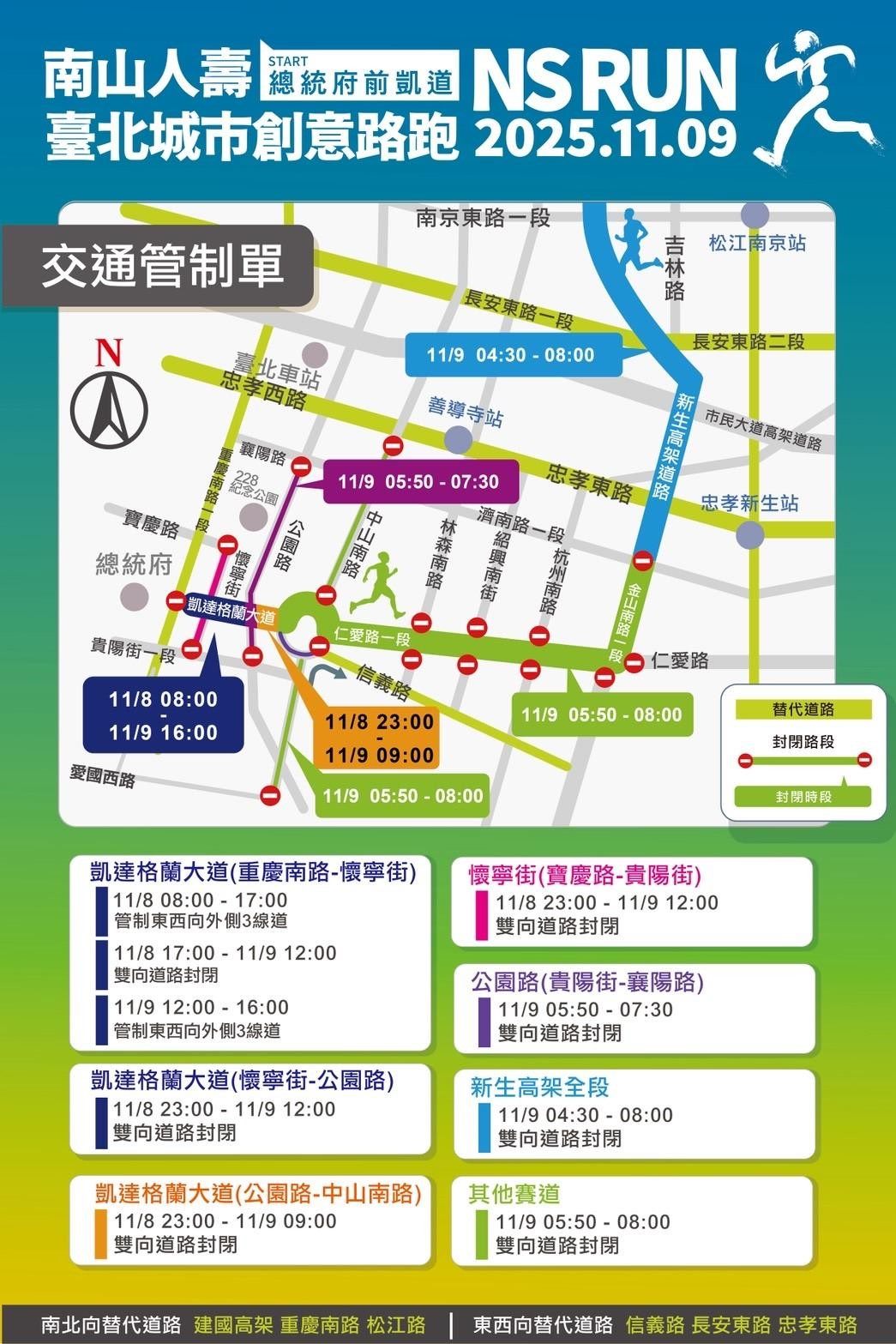 南山人壽保險股份有限公司、創意實踐家企業有限公司訂於114年11月9日(星期日),假本市凱達格蘭大道等道路辦理「2025南山人壽臺北城市創意路跑」,為維護交通秩序與活動安全,臺北市政府警察局將實施交通管制,禁止車輛通行,管制路段及時間如下:一、11月8日8時至17時:管制凱達格蘭大道(重慶南路至懷寧街)東西向外側各3線車道;於17時至23時管制全線車道。二、11月8日23時至11月9日12時:管制凱達格蘭大道(重慶南路至公園路)、懷寧街(寶慶路至貴陽街)全線車道。三、11月8日23時至11月9日9時:管制凱達格蘭大道(公園路至中山南路)全線車道。四、11月9日管制路段及時間:(一)凱達格蘭大道(懷寧街至公園路):0時至12時管制全線車道;12時至16時管制西往東外側3線車道。(二)凱達格蘭大道(公園路至中山南路):0時至9時管制全線車道。(三)懷寧街(寶慶路至貴陽街):0時至12時管制全線車道。(四)公園路(貴陽街至襄陽路):5時50分至7時30分管制全線車道。(五)中山南路(景福門圓環路段):5時50分至8時管制北往南車道。另南往北車流,管制於景福門右轉信義路直行。(六)仁愛路(中山南路至金山南路):5時50分至8時管制中央4線車道(含公車專用道);6時至7時管制北側慢車道。(七)金山南路(濟南路至仁愛路):5時50分至8時管制南往北內側2線車道及北往南全線車道。(八)新生高架道路(通河街至濟南路):4時30分至8時管制新生高架道路雙向車道。 活動期間,請用路人避開交通管制路段,提前改道行駛,規劃改道動線如下:一、「凱達格蘭大道東西向車流」請改道行駛貴陽街或愛國西路。二、「仁愛路東往西方向車流」請改道行駛仁愛路南側慢車道、愛國東路或忠孝東路。三、「欲穿越仁愛路及景福門圓環之南、北向車流」請改道行駛金山南路(南往北)、重慶南路。四、「原新生高架道車流」請改道行駛新生北路、中山北路。 活動期間賽道沿線實施交通管制,禁止車輛通行,管制範圍內之公車候車處暫停服務,民眾如欲查詢公車改道路線,請利用臺北市公共運輸處網站http://pto.gov.taipei查詢相關資訊。 為維護本市道路交通安全與順暢及減少用路人因交通管制造成之不便,該局籲請用路人留意收聽警察廣播電臺路況插播,並遵守各路口執勤員警及義交人員指揮、疏導,共同維護交通安全與秩序。