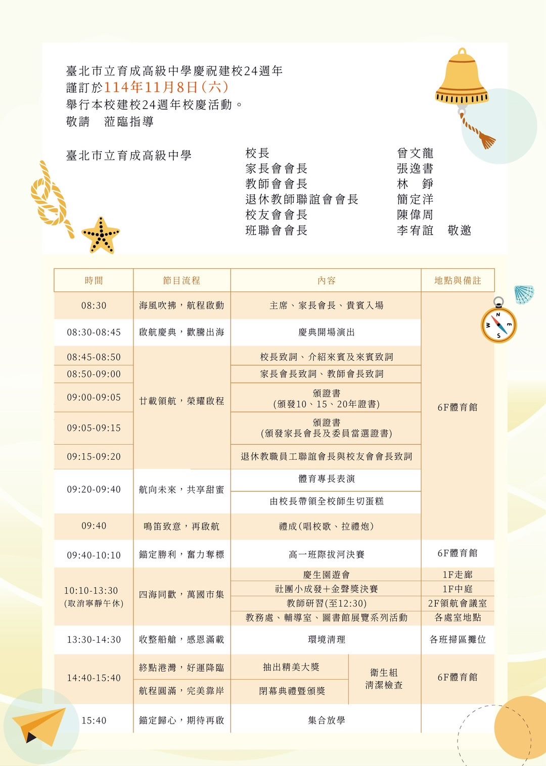 臺北市立育成高級中學誠摯邀請歷屆校友、家長與社區民眾蒞臨,共同見證「育苗廿載,成才四海」的教育成果,攜手為育成的未來再度揚帆啟航。