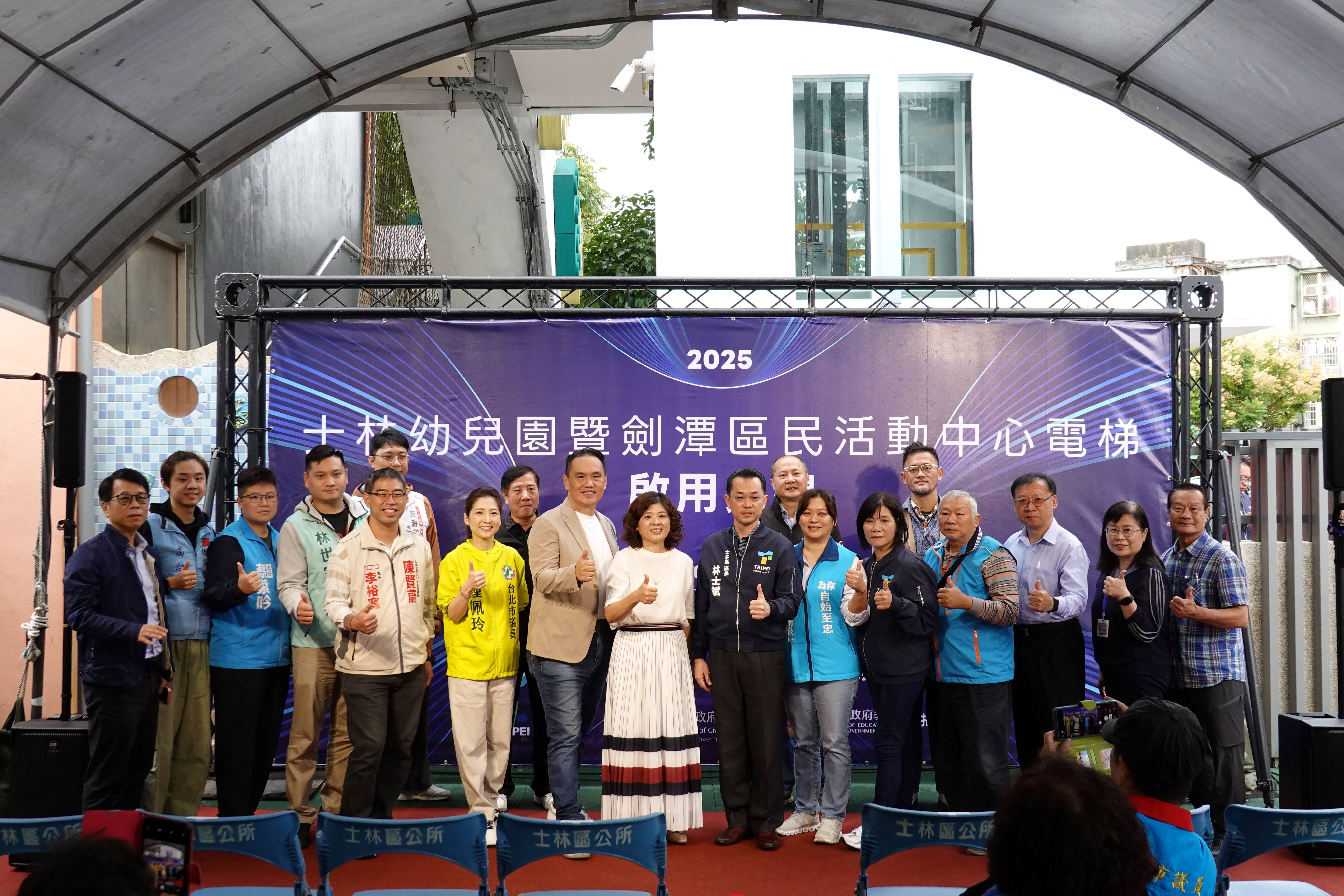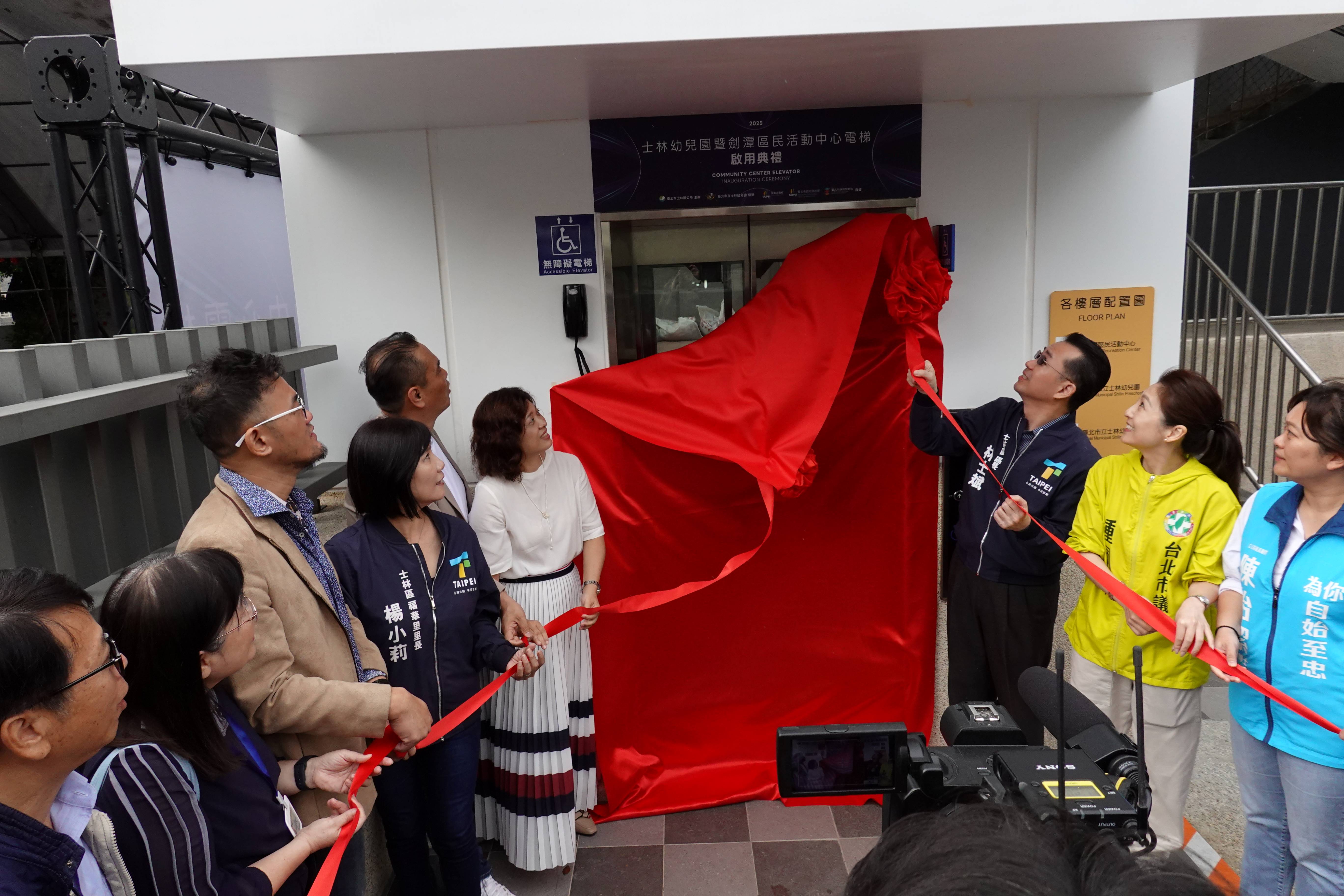 士林幼兒園暨劍潭區民活動中心電梯啟用囉,114年11月5日上午在士林區區長林士斌、士林幼兒園園長劉紀婷、福華里里長楊小莉、臺北市議會陳重文議員、鍾佩玲議員及多位貴賓共同完成揭幕儀式後,正式啟用。