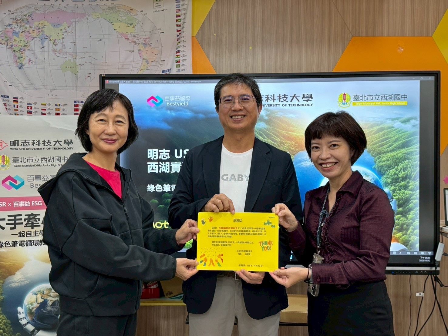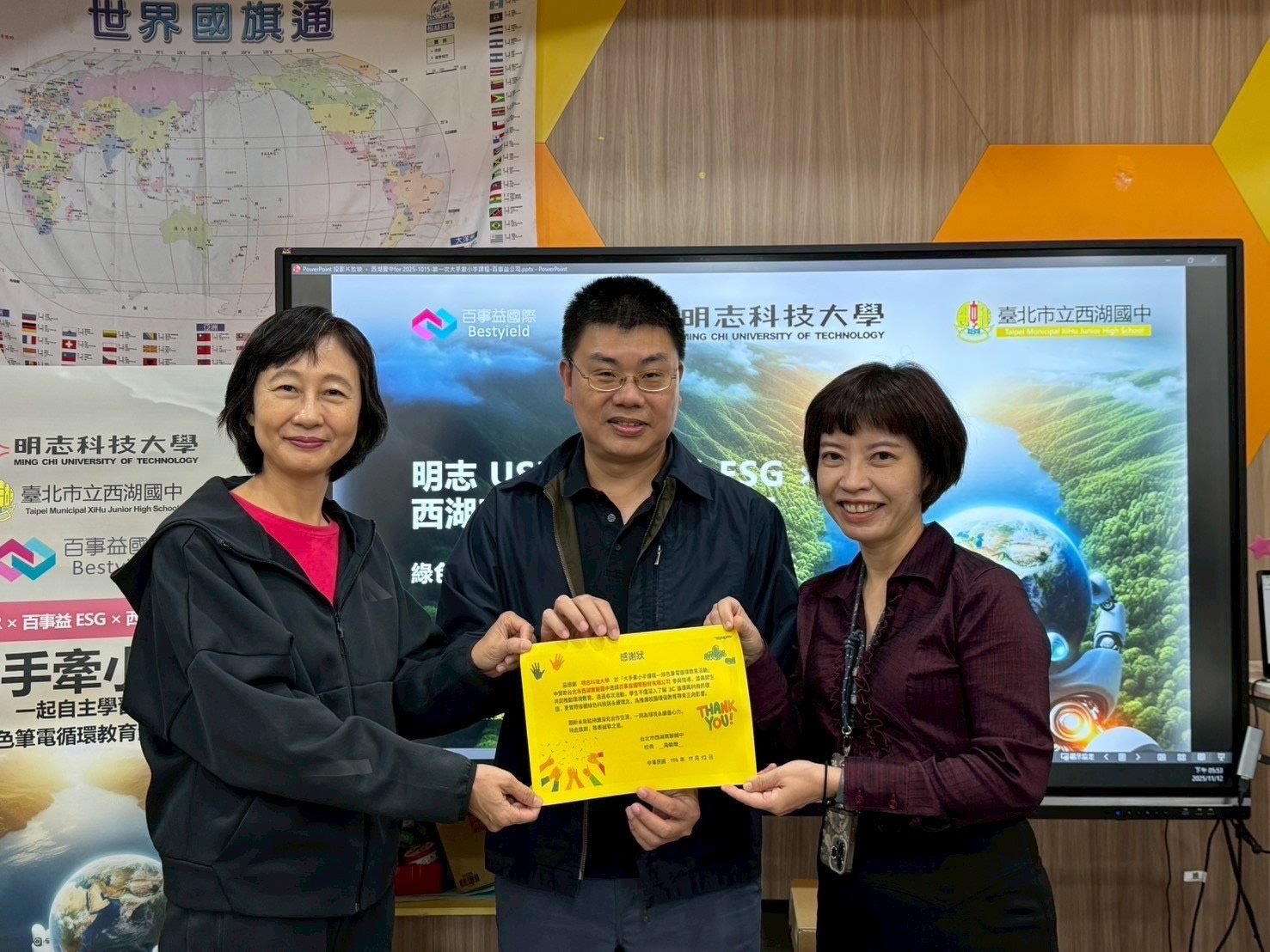【臺北報導】產官學合作—西湖實驗國中大手牽小手計畫形成蝴蝶效應,擴散影響力,教育與USR與ESG完美結合。下午細雨綿綿,但西湖實驗國中辦理臺北市教育局「大手牽小手」計畫卻熱情滿滿,因為本校攜手明志科技大學USR計畫與百事益國際股份有限公司ESG企業社會責任專案,在西湖實中高毓璇校長領導的教務處的努力整合與籌辦下,完成了「ESG筆記型電腦環保再造共學成果發表會」。