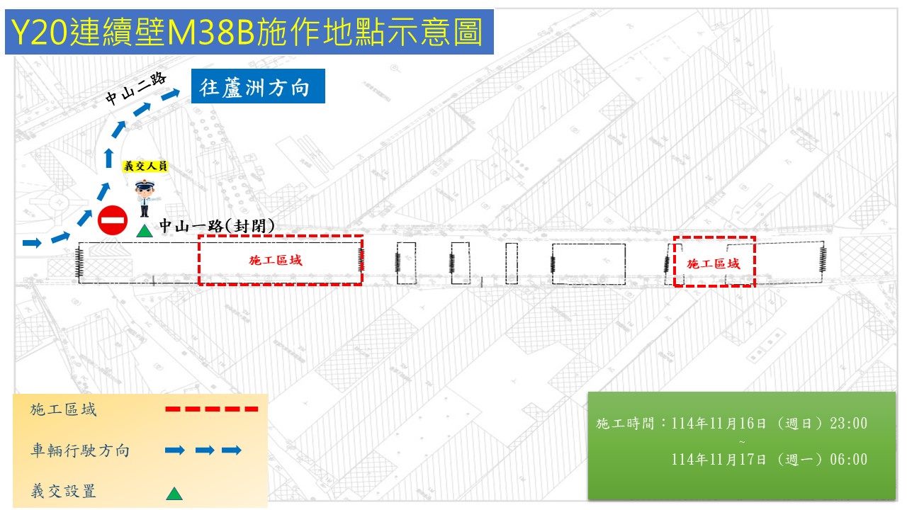 為配合捷運北環段CF680A區段標工程施作站體南側連續壁工程,施工單位將於114年11月16日23時起迄11月17日上午6時止,將封閉蘆洲區中山一路415號(消防局前)至中山一路339巷口止之單行道,俾進行車站站體連續壁M38B單元搭接鋼筋籠作業,施工期間因吊車占據車道且吊掛物旋轉時會超越圍籬範圍外,為維護大眾安全,屆時將封閉中山一路單行車道路段,所有車輛均請改行駛中山二路進入蘆洲市區,本工程施作當日若遇豪大雨則順延至次日施工,相關本次影響行車動線範圍,如附圖所示。 施工期間請用路人配合改道通行,如行經施工區域請減速慢行,並請遵循相關導引標誌、標線及現場指揮人員導引減速慢行,民眾如有任何問題以及建議事項,或想瞭解最新施工動態,可隨時利用下列聯絡電話反映,將有專人竭誠為您服務與解說,施工造成暫時不便,敬請見諒。