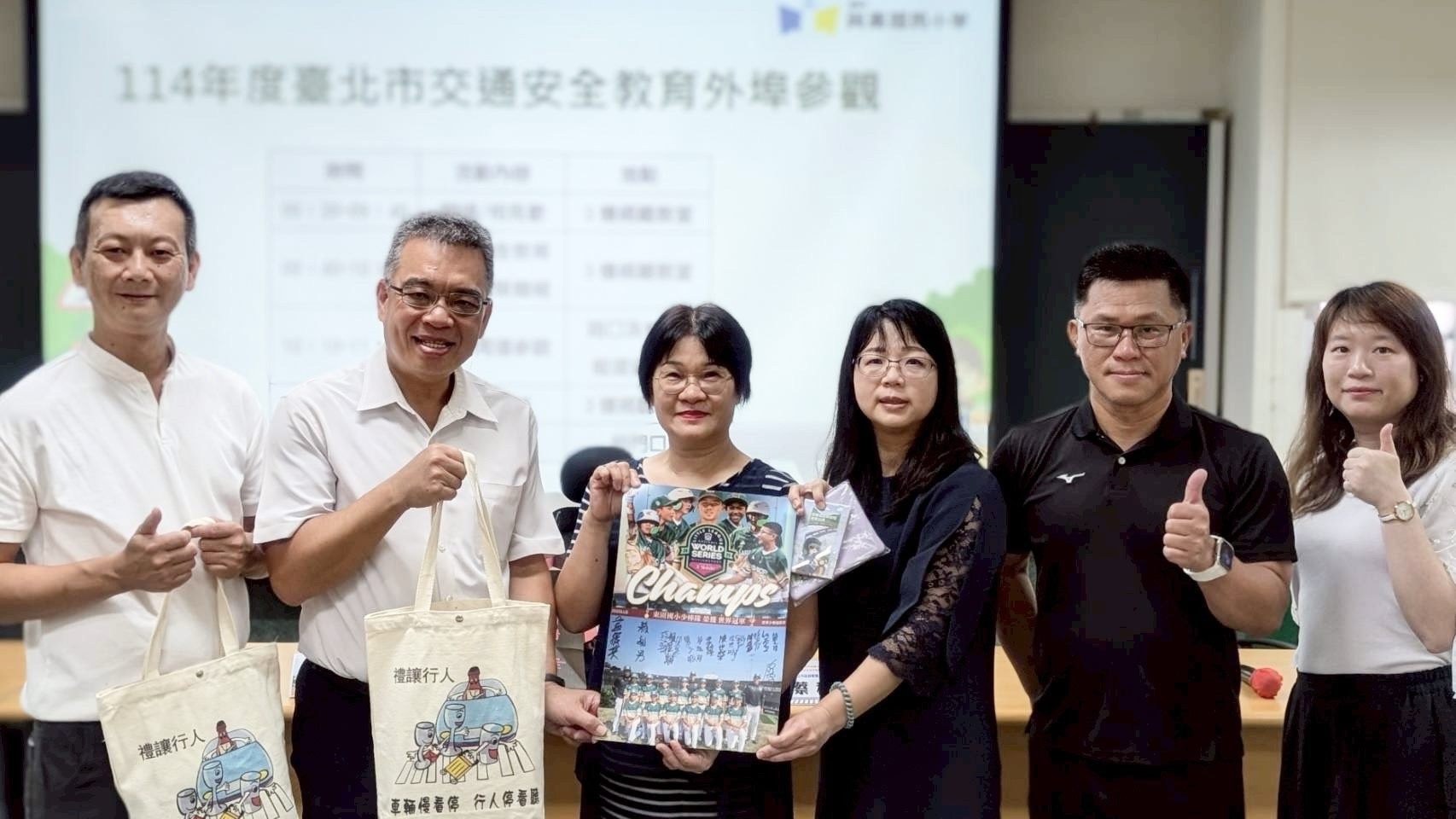 參訪過程中,各校分享了交通安全教育的特色措施與推動成果,例如新北市莒光國小巧妙規劃通學動線迅速紓解3,000多人放學人潮、嘉義市興嘉國小改善通學環境提供學童通學安全、高雄市苓雅國中讓學生透過智能小車編寫程式親身體驗「內輪差」的危險情境、高雄市中正高中善用AI科技製作雙語教安宣導影片,皆為本市推展交通安全教育的重要參考。另外值得一提的是,在嘉義市興嘉國小,因少棒隊的緣分,東園國小特地致贈今年威廉波特少棒冠軍隊簽名海報給該校,大家一起在交安、體育領域互相勉勵期許,成為活動中最具感動的交流亮點。此次交流不僅拓展了視野,也有助於未來回到學校後推動更多創新做法,為臺北市打造更安全的校園交通環境。