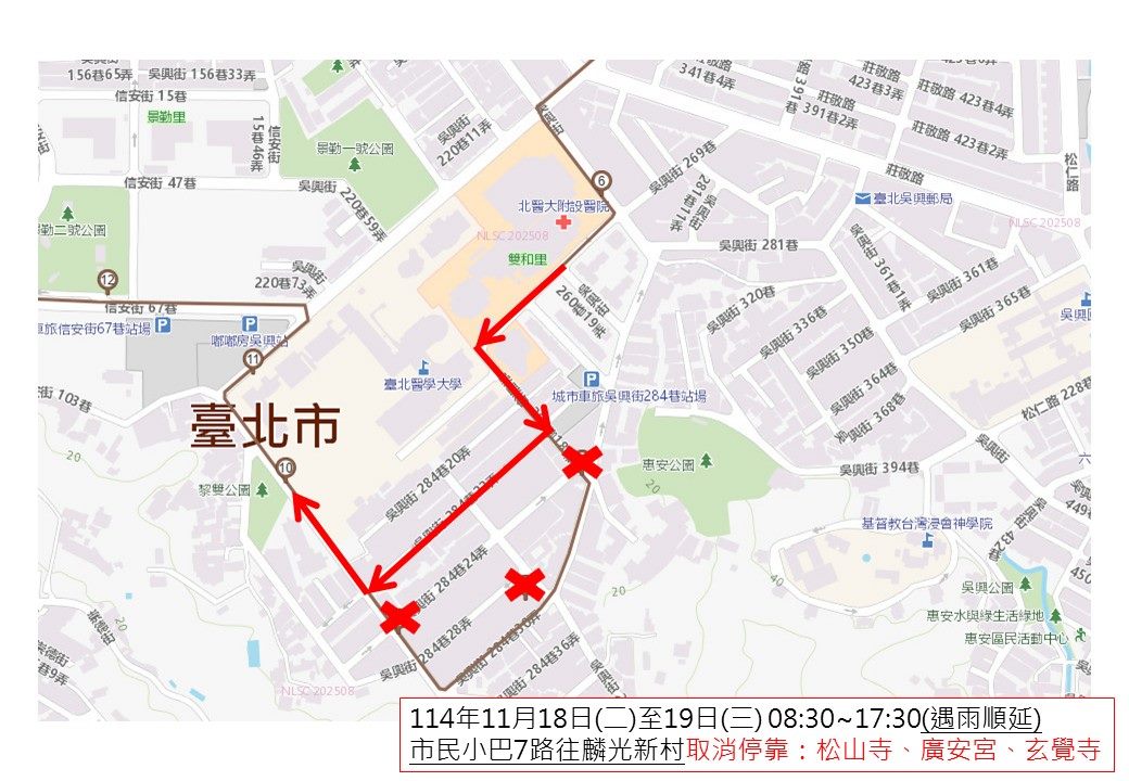 因應114年11月18日至19日信義區吳興街284巷路面更新工程,公車配合調整措施
