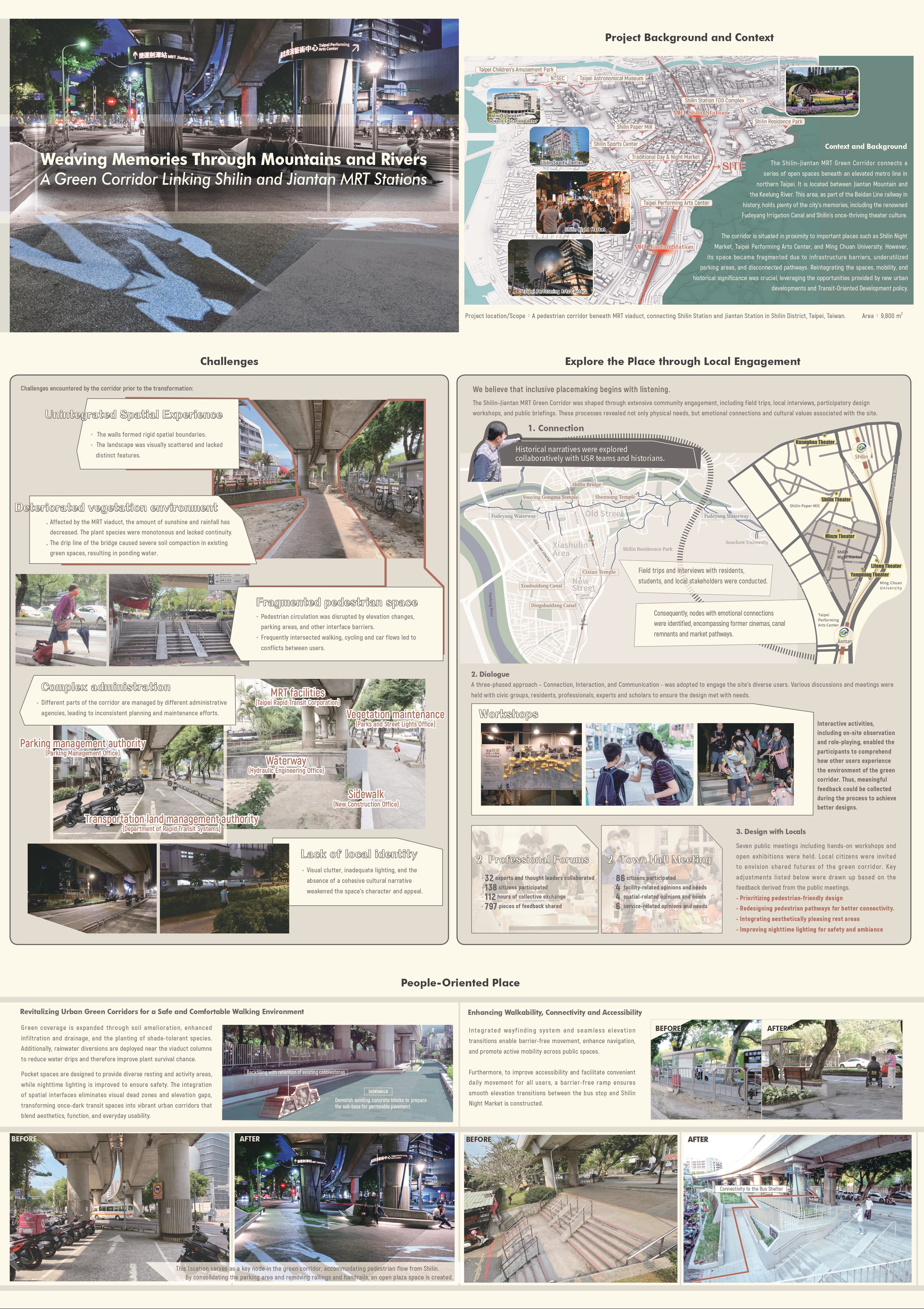 公園處說明,榮獲「文化與都市景觀類」佳作獎的「穿梭於山河之間的記憶—士林劍潭捷運綠廊(捷運綠廊人行動線)」全長約600公尺,串聯捷運士林站與劍潭站之間的都市綠帶,連接劍潭山步道、士林官邸與士林夜市等地標,形成一條融合自然生態與人文生活的重要軸線,設計以「都市共融、人本友善」為核心理念,重新整合人行動線,開啟視覺通透、交流互動的城市界面,使公共空間在白晝與夜間皆能安全而宜人地使用,讓歷史與當代在空間中交織,展現臺北在公共空間再生與永續設計上的創新能量。
