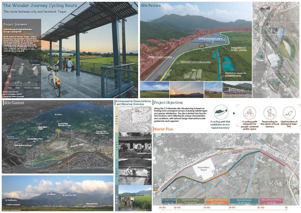 同樣榮獲「文化與都市景觀類」佳作獎的「騎幻之旅—位於臺北市一隅的農田小徑(大業路527巷環境整體改造)」關渡洲美地區的自行車與人行網絡,串聯市區與河濱步道,形成關渡平原的大迴圈,設計以生態共融與人本友善為理念,透過人行道拓寬、設施修繕與休憩節點塑造,保留臺北市僅存的農田景觀,延續在地自然氛圍,結合河濱景觀、水鳥保護區及關渡自然公園等資源,打造兼具美感安全舒適的友善環境,同時提供優質景觀公廁,以安全、明亮、舒適為原則,為市民提供一處安全又優質的遊憩環境。