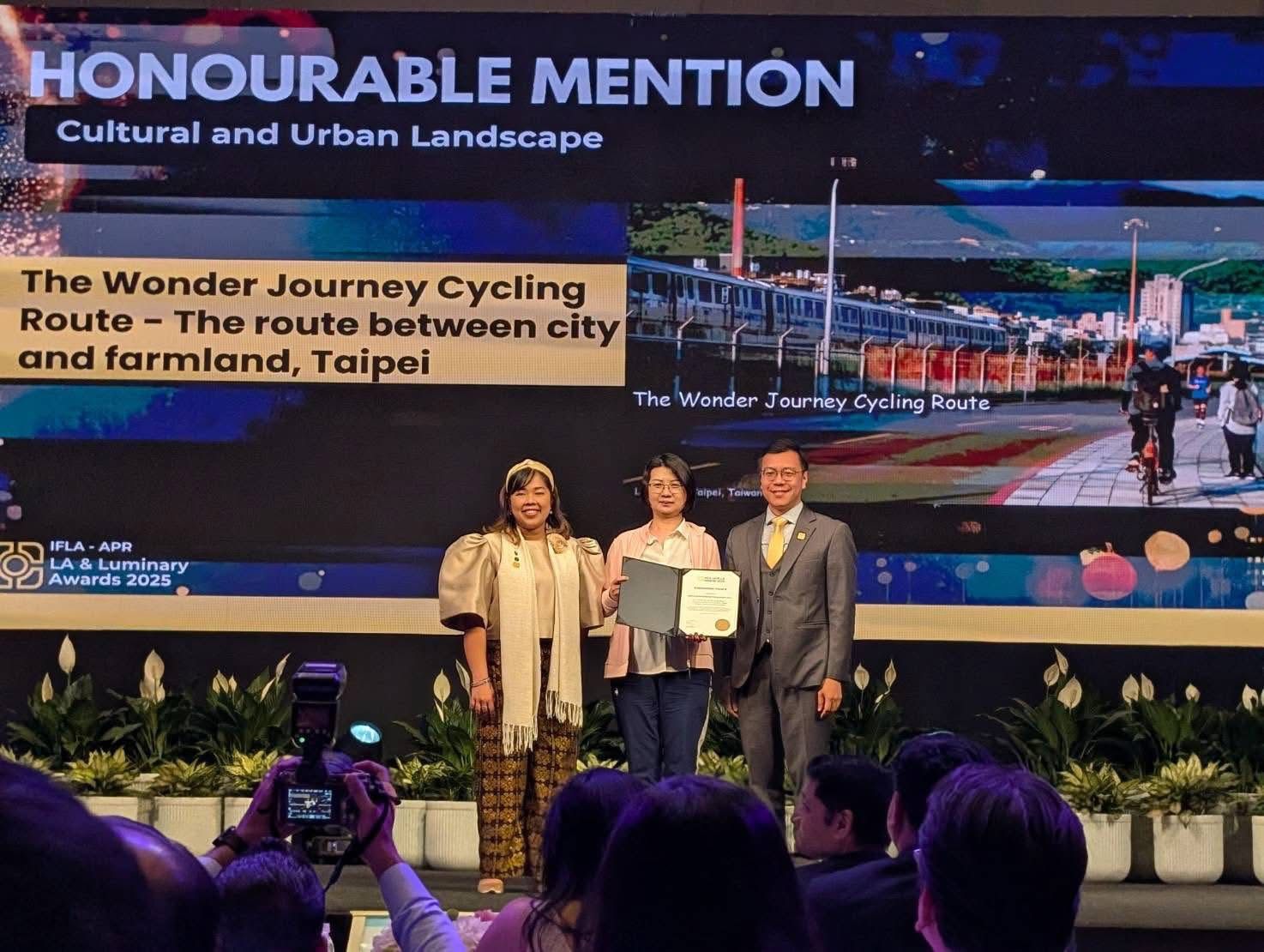 今年代表臺灣公部門參賽亞太景觀大賞(IFLA-APR LA Awards)的9件獲獎作品中,公園處一舉奪下3項大獎,展現亮眼實力與創新能量。3件作品分別為:穿梭於山河之間的記憶—士林劍潭捷運綠廊(捷運綠廊人行動線)、騎幻之旅—位於臺北市一隅的農田小徑(大業路527巷環境整體改造)、光引謐徑—竹柏參道光環境(竹柏參道夜間光環境營造),3項作品在國際舞台上脫穎而出,充分展現臺北市推動公共空間與永續景觀卓越成果。