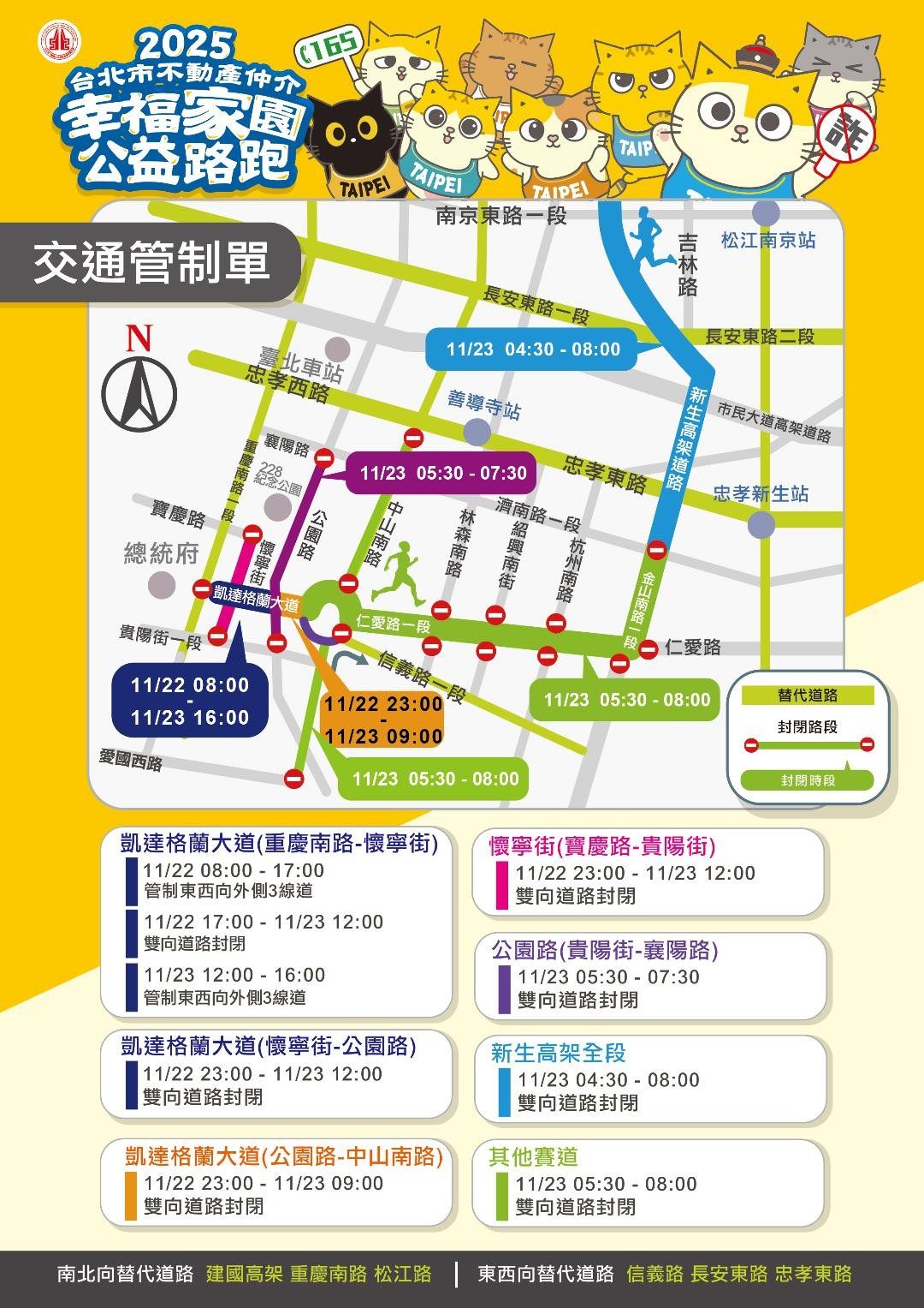 台北市不動產仲介同業經紀商業同業公會、創意實踐家企業股份有限公司及台灣路跑運動協會訂於114年11月23日(星期日),假本市凱達格蘭大道等道路辦理「2025台北市不動產仲介幸福家園公益路跑」,為維護交通秩序與活動安全,臺北市政府警察局將實施交通管制,禁止車輛通行,管制路段及時間如下:一、11月22日8時至17時:管制凱達格蘭大道(重慶南路至懷寧街)東西向外側各3線車道;於17時至23時管制全線車道。二、11月22日23時至11月23日12時:管制凱達格蘭大道(重慶南路至公園路)、懷寧街(寶慶路至貴陽街)全線車道。三、11月22日23時至11月23日9時:管制凱達格蘭大道(公園路至中山南路)全線車道。四、11月23日管制路段及時間:(一)凱達格蘭大道(懷寧街至公園路):0時至12時管制全線車道;12時至16時管制東西向外側各3線車道。(二)凱達格蘭大道(公園路至中山南路):0時至9時管制全線車道。(三)懷寧街(寶慶路至貴陽街):0時至12時管制全線車道。(四)公園路(貴陽街至襄陽路):5時30分至7時30分管制全線車道。(五)中山南路(景福門圓環路段):5時30分至8時管制北往南車道。另南往北車流,管制於景福門右轉信義路直行。(六)仁愛路(中山南路至金山南路):5時30分至8時管制中央4線車道(含公車專用道);5時40分至7時管制北側慢車道。(七)金山南路(濟南路至仁愛路):5時30分至8時管制南往北內側2線車道及北往南內側2線車道。(八)新生高架道路(通河街至濟南路):4時30分至8時管制新生高架道路雙向車道。 活動期間,請用路人避開交通管制路段,提前改道行駛,規劃改道動線如下:一、「凱達格蘭大道東西向車流」請改道行駛貴陽街或愛國西路。二、「仁愛路東往西方向車流」請改道行駛仁愛路南側慢車道、愛國東路或忠孝東路。三、「欲穿越仁愛路及景福門圓環之南、北向車流」請改道行駛金山南路(南往北)、重慶南路。四、「原新生高架道車流」請改道行駛新生北路、中山北路。 活動期間賽道沿線實施交通管制,禁止車輛通行,管制範圍內之公車候車處暫停服務,民眾如欲查詢公車改道路線,請利用臺北市公共運輸處網站http://pto.gov.taipei查詢相關資訊。 為維護本市道路交通安全與順暢及減少用路人因交通管制造成之不便,該局籲請用路人留意收聽警察廣播電臺路況插播,並遵守各路口執勤員警及義交人員指揮、疏導,共同維護交通安全與秩序。