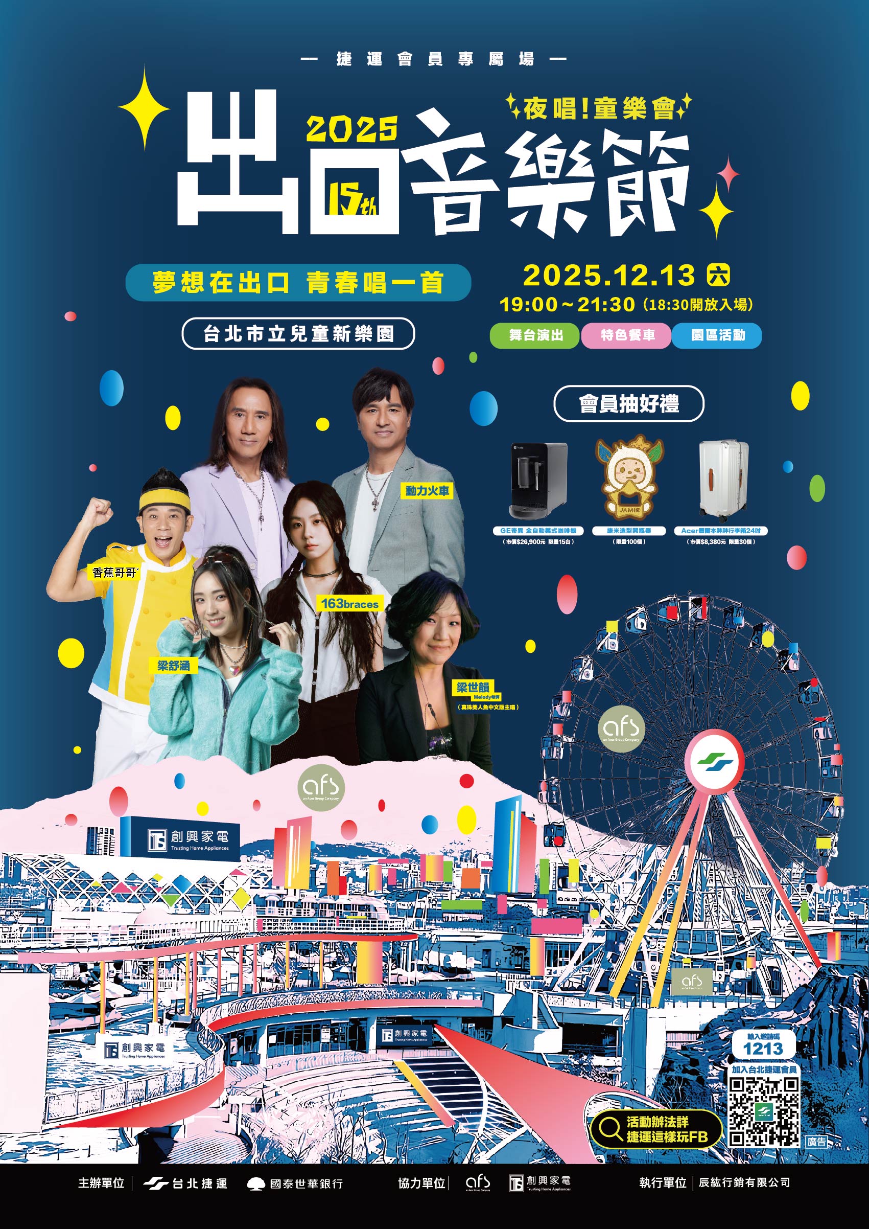 2025出口音樂節,今年首度移師兒童新樂園登場!今年邁入第15屆的出口音樂節,以「夜唱!童樂會」為主題,即將於12月13日晚間在兒童新樂園夜間包場舉辦會員專屬場,活動除精彩演出外,也將開放園區遊樂設施免費暢玩,打造音樂、娛樂與童趣兼具的年度壓軸盛會!11月21日中午12時起,「台北捷運Go」App會員憑10點捷運點,即可兌換限量優先入場券1張;若錯過優先入場券也不要失望,活動當日App會員持綁定電子票證搭乘捷運,並出示搭乘紀錄,即可免費入場,快把這場冬季最療癒的童樂派對收進行事曆。