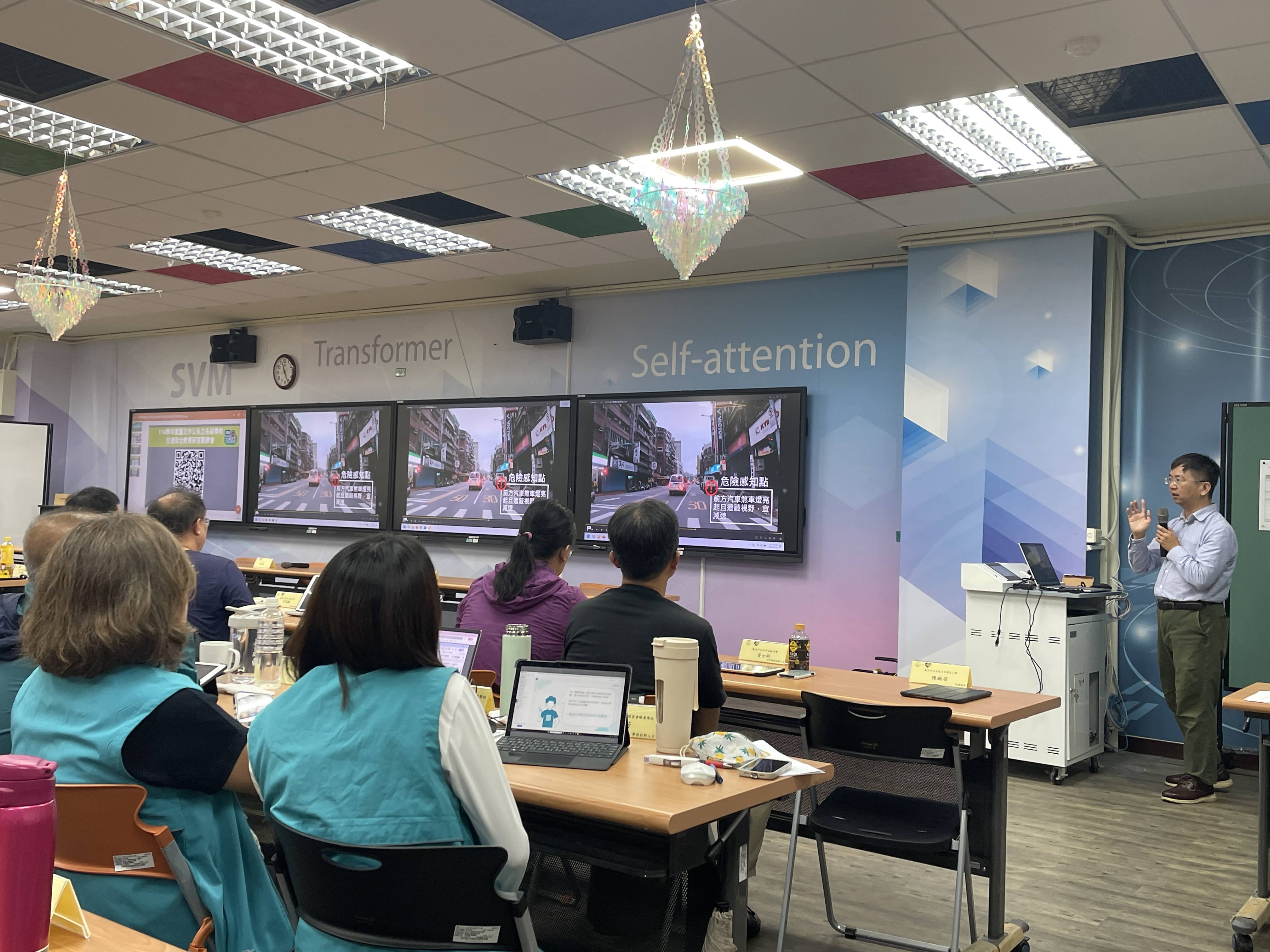 而在高中職交通安全教育觀摩研習部分,今年研習場地運用育成高中的智慧學習教室,邀請交通部運輸研究所喻世祥副組長介紹「交通安全教育教學輔助軟體」,讓高中職的交安承辦人員可以了解該軟體內容,並且在教室內以平板數位模擬技術重現真實道路情境,學生可透過操作體驗人車互動、分析錯誤行為,進一步驗證交通法規的重要性,這種寓教於樂的科技學習方式,讓用路安全教育更貼近年輕世代的學習習慣。