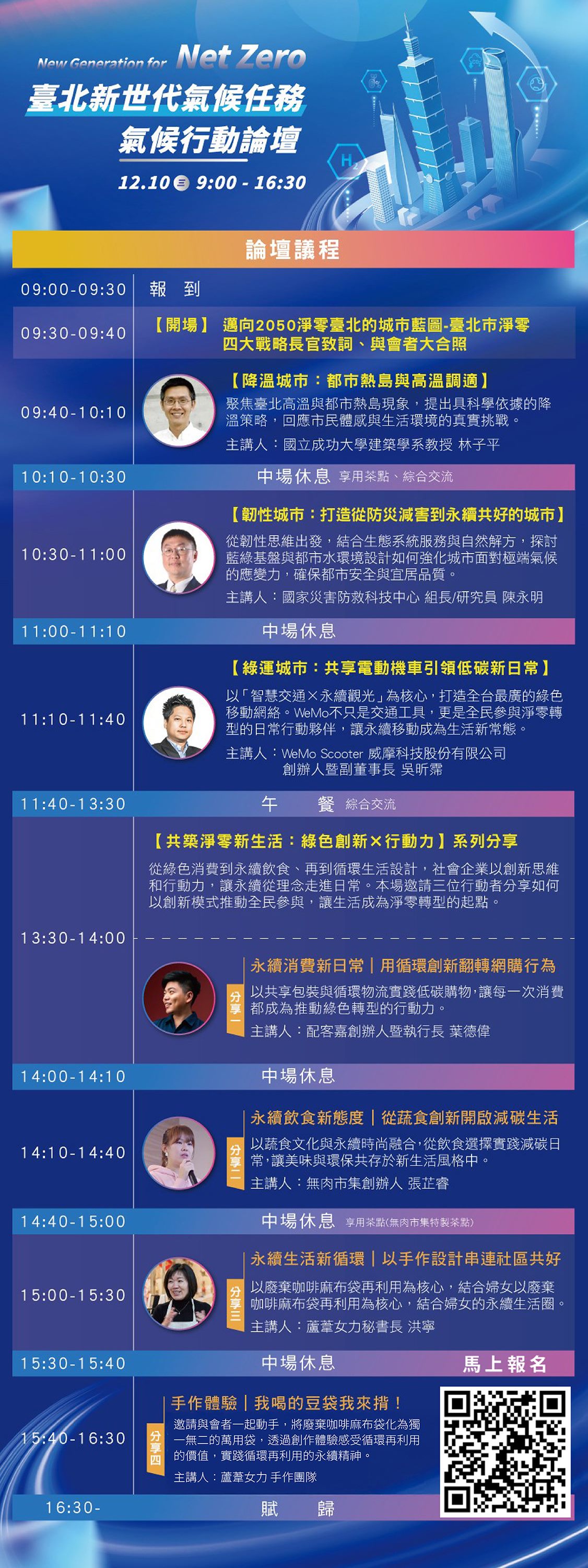 為協助新世代理解城市淨零藍圖,臺北市環保局將邀請專家、企業等攜手合作,於 114 年 12 月 10 日(三)上午9時至16時30分於三創生活園區舉辦「New Generation for Net Zero|臺北新世代氣候任務」氣候行動論壇,活動即日起開放線上報名(報名網址,名額 100名,額滿為止),歡迎有興趣的青年踴躍報名參加。