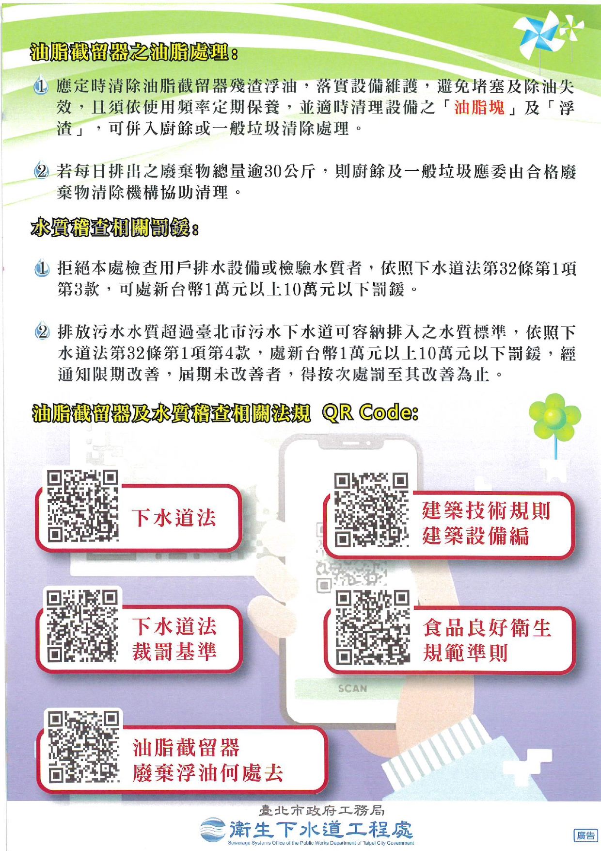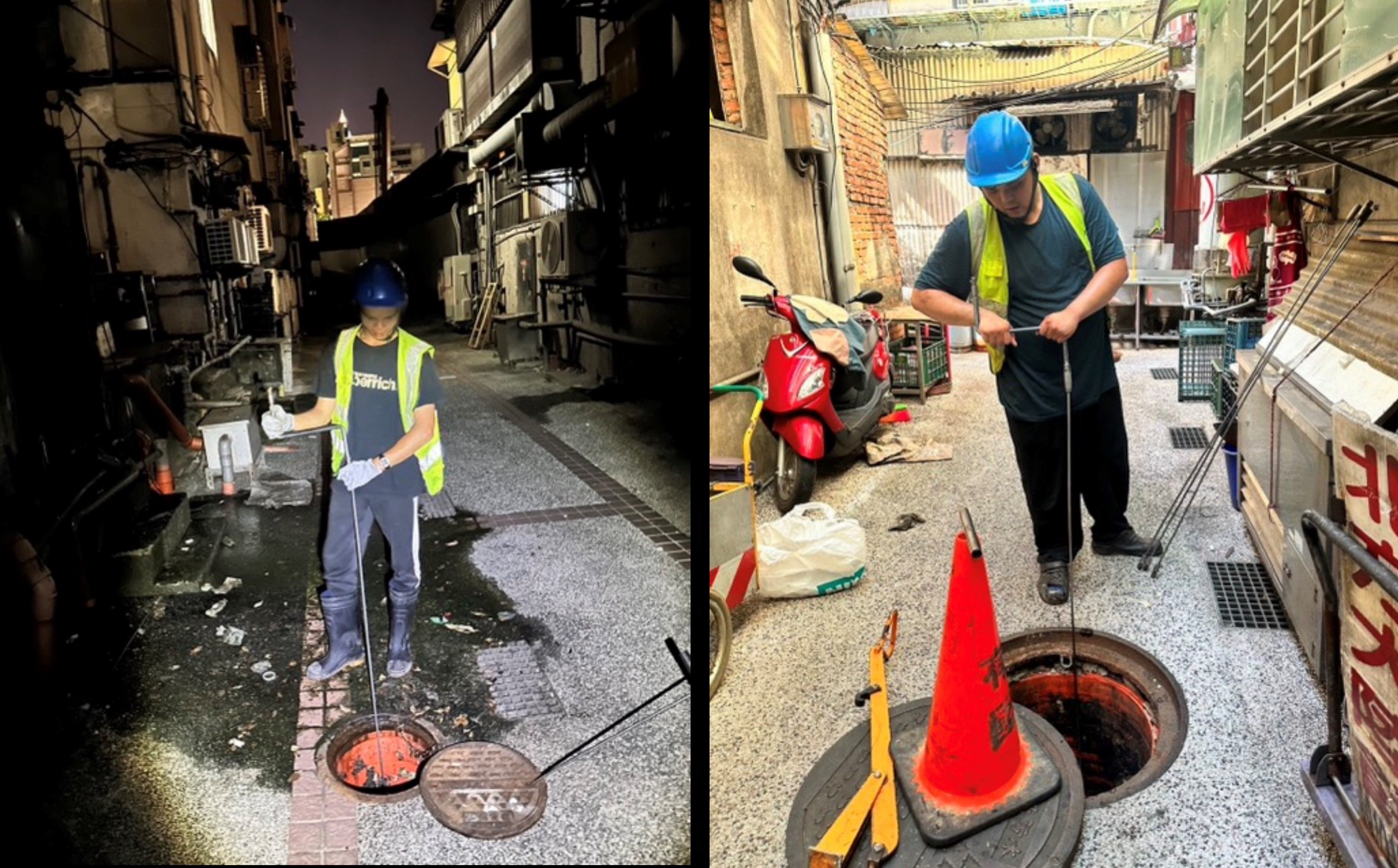 衛工處營運管理科長劉容伶表示,臺北市污水下水道建設長度約2,722公里,負責將生活污水輸送至污水處理廠進行淨化。為確保排水順暢,衛工處除超前部署,加強堵塞熱區巡查與清疏外,也從源頭著手,每兩個月定期邀集環保局與衛生局實施聯合稽查。對於未裝設油脂截留器的業者,於宣導後一個月複查,若經三次宣導仍未安裝者,將移送建管處依法處置。