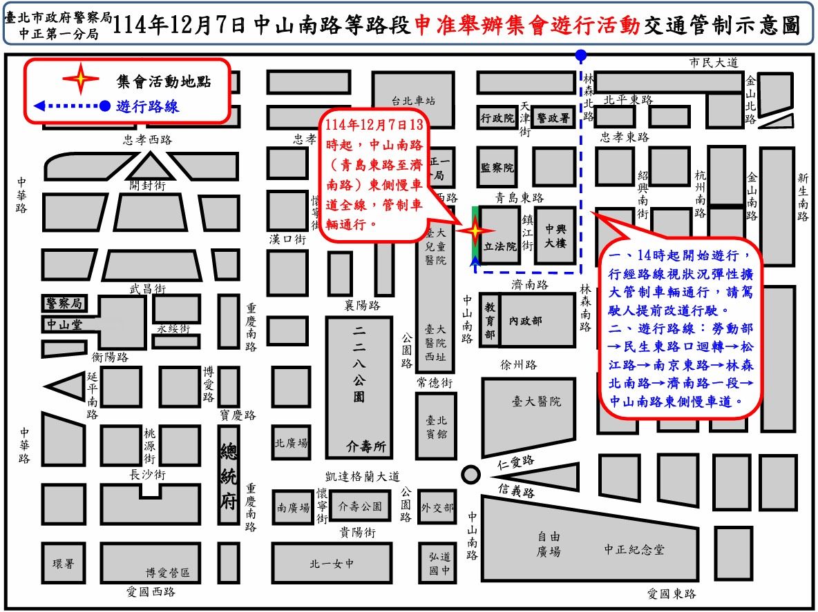 有關114年12月7日中山南路、林森南路等路段舉行集會遊行活動實施交通管制、疏導措施說明
