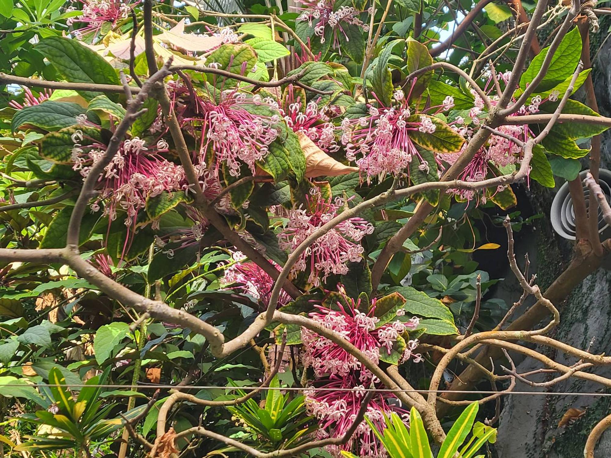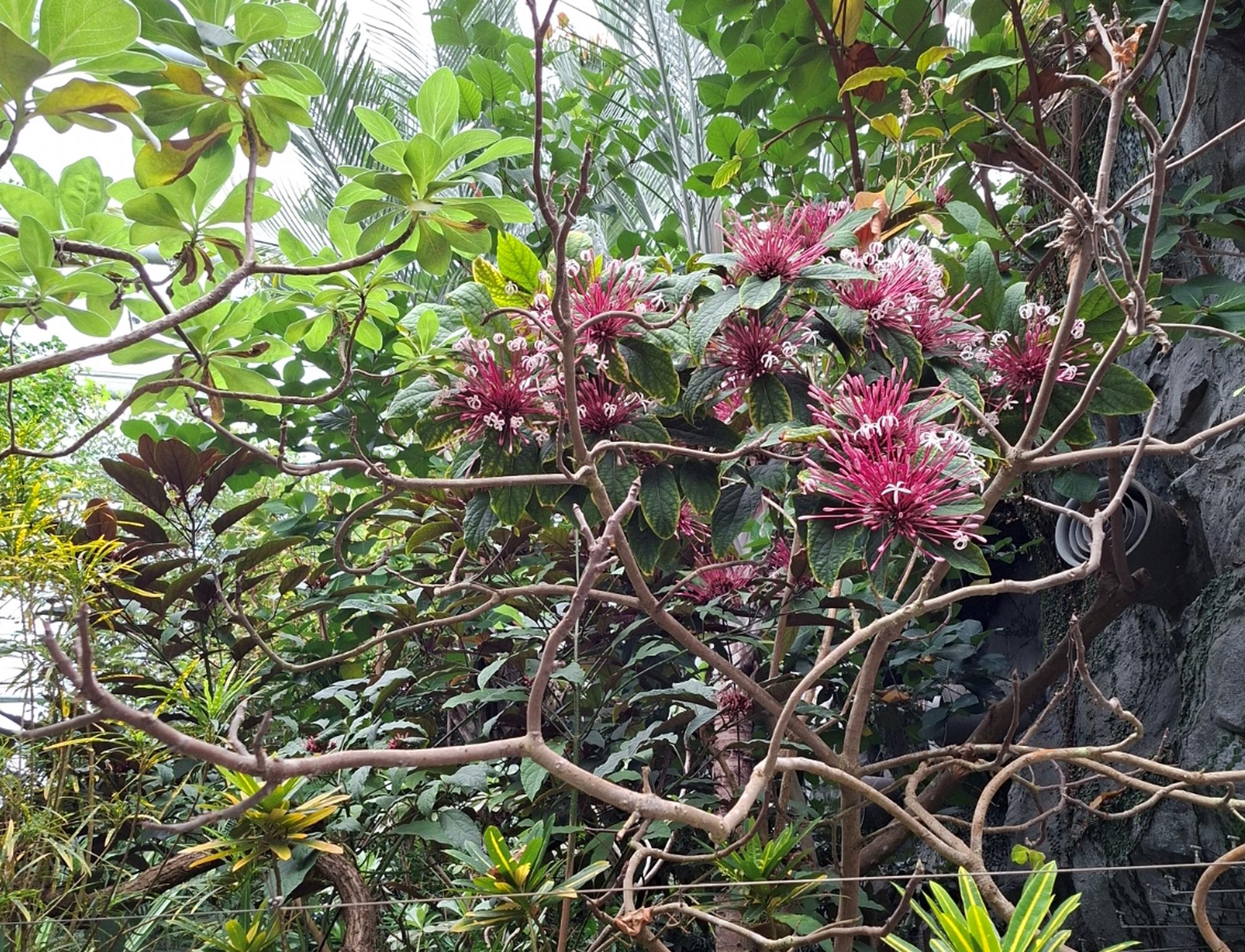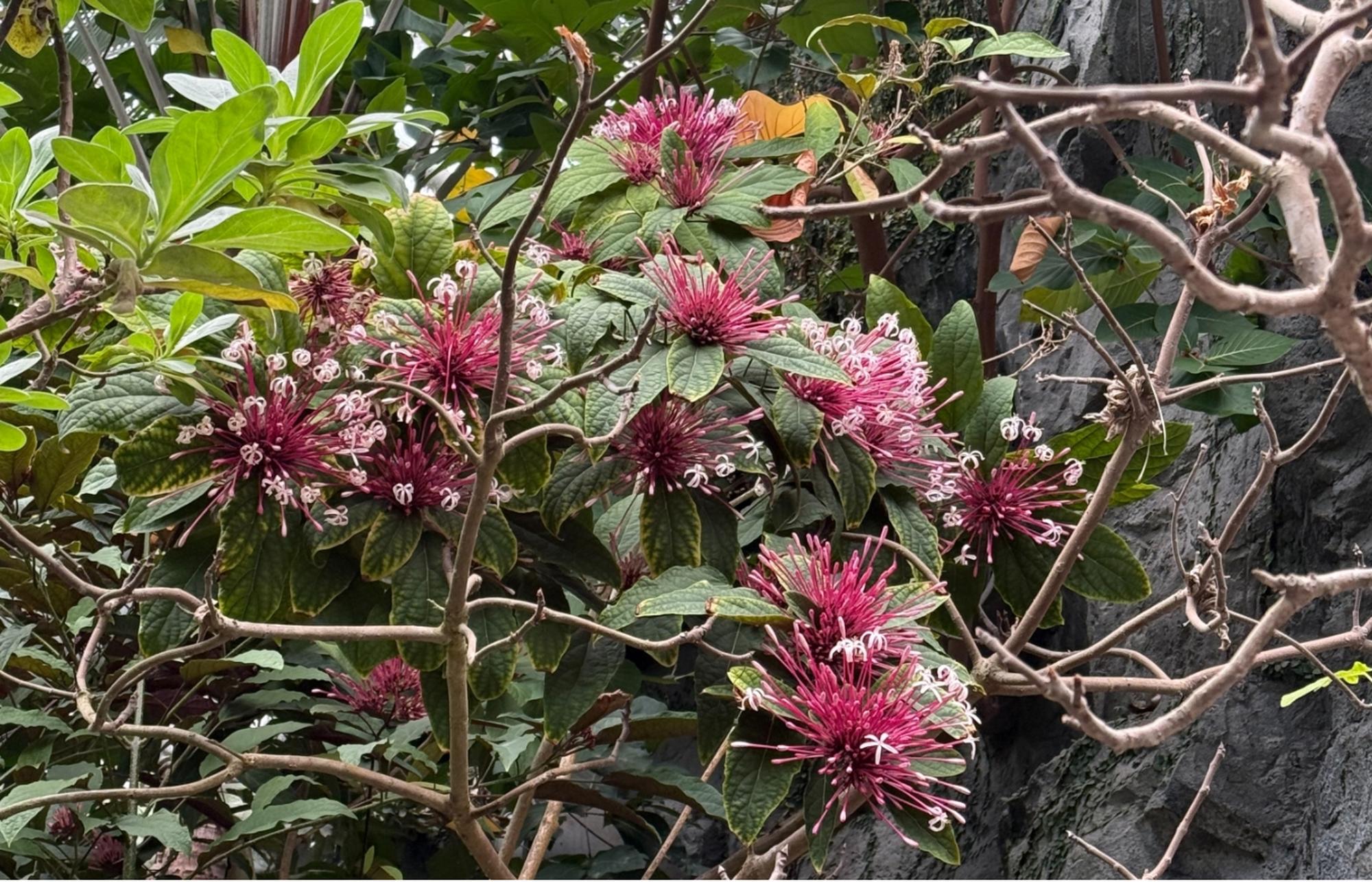《煙火樹》屬常綠灌木,花期長達三個月,原產新幾內亞至菲律賓。葉面綠色,葉背紫紅色。聚繖花序頂生,筒狀花基部紫紅色,白色花冠5裂,有香味。果實紫黑色。開花冬至春季。葉色特殊,花序大而醒目,有很好的聚焦效果,本種花序直徑可達20公分以上,開花如煙火般壯大華麗,世界各地植物園溫室常栽培作為主題特色樹種。