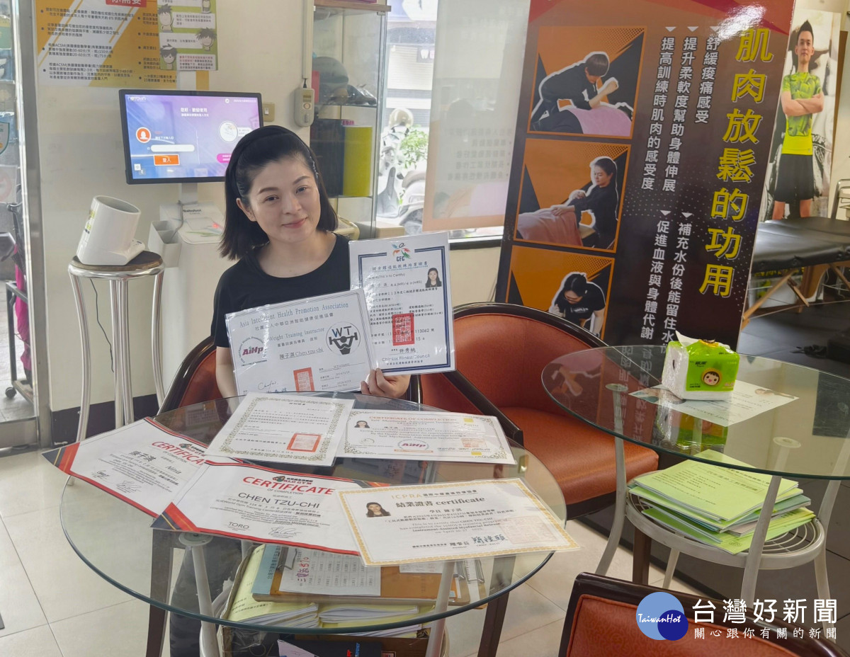 子淇說,逼自己成長、我的人生不設限!雖然有按摩經絡的基底,但運動按摩和過去是截然不同的領域,在訓練單位的建議下,持續報名參訓健身運動健康指導及體適能實務,讓自己更了解人體肌群,讓從不運動的她開啟健身大門,除改善尾椎不適的舊疾,更透過課程考取L1-L2重量指導員、C級健身體適能教練、放鬆肌筋膜調整技術員等多張證照,現在的她除教導運動按摩課程外,仍持續參加產投的運動相關課程,提升健身領域的專業職能。