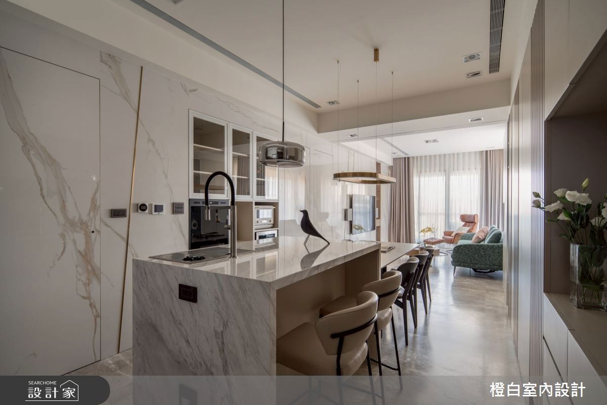 廚房採半開放式設計,將烹飪區規畫於內部,外部則延伸中島吧檯和電器櫃,既能有效擴大廚房機能,也降低油煙逸散的可能性。設計師在廚房牆面加入烤玻材質,更方便進行日常清潔,亦能成為備忘錄和家人的留言空間。