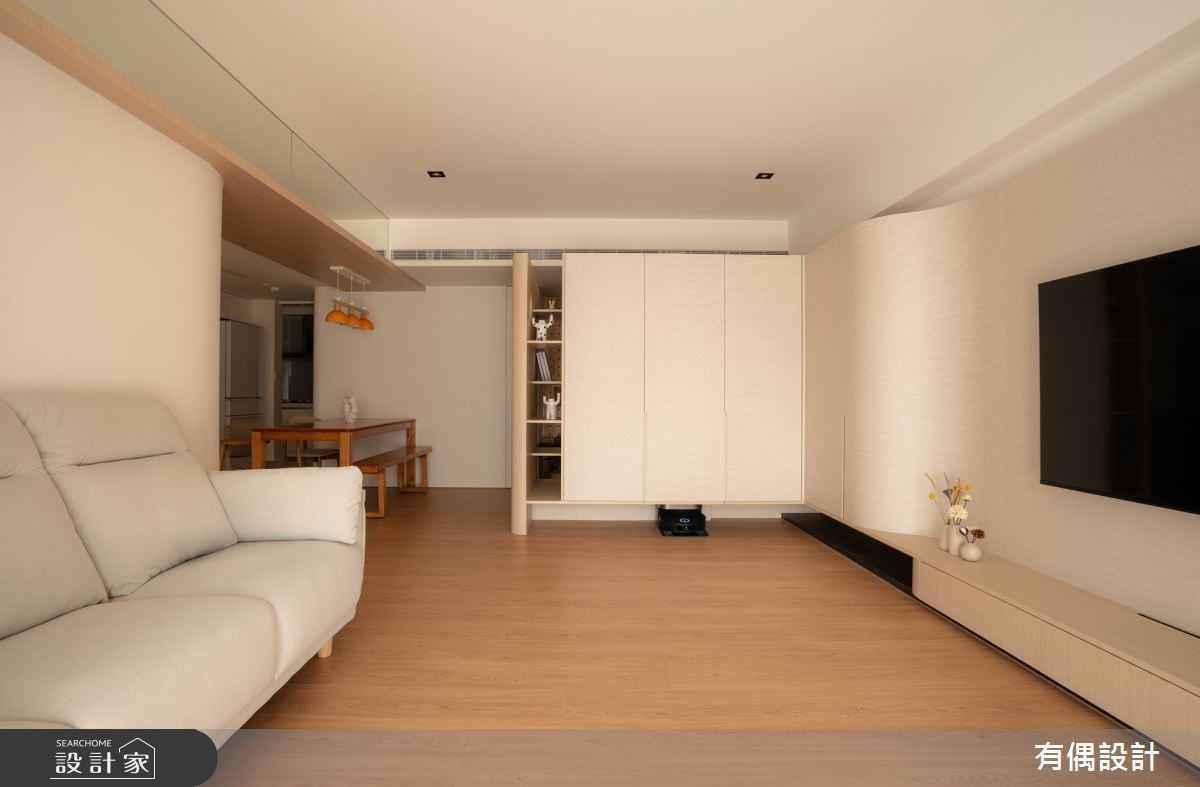 這間位於新北市精華地區的 35 坪的新成屋,在裝修上不僅需要考量一家五口來規劃廳房,更透引入光影、優化動線與風格刻畫,構築了一個充滿光影、流動與溫暖的現代混搭風格居所。設計的核心概念並非僅是功能的堆疊,而是以「漫、沐、韻」三字為引,讓家成為一首緩緩流淌的旋律;為了滿足一家人的生活需求,有偶設計團隊對空間做細膩劃分,規劃出舒適的四房兩廳兩衛。因人口數多因此需要較多儲藏空間,透過分區規劃與櫃體雙面應用做到收納最大化,同時考量到家中幼兒,再轉角都做了圓弧倒角設計升級居家安全,體現了空間效率與現代家庭所嚮往的自在感與安定感。