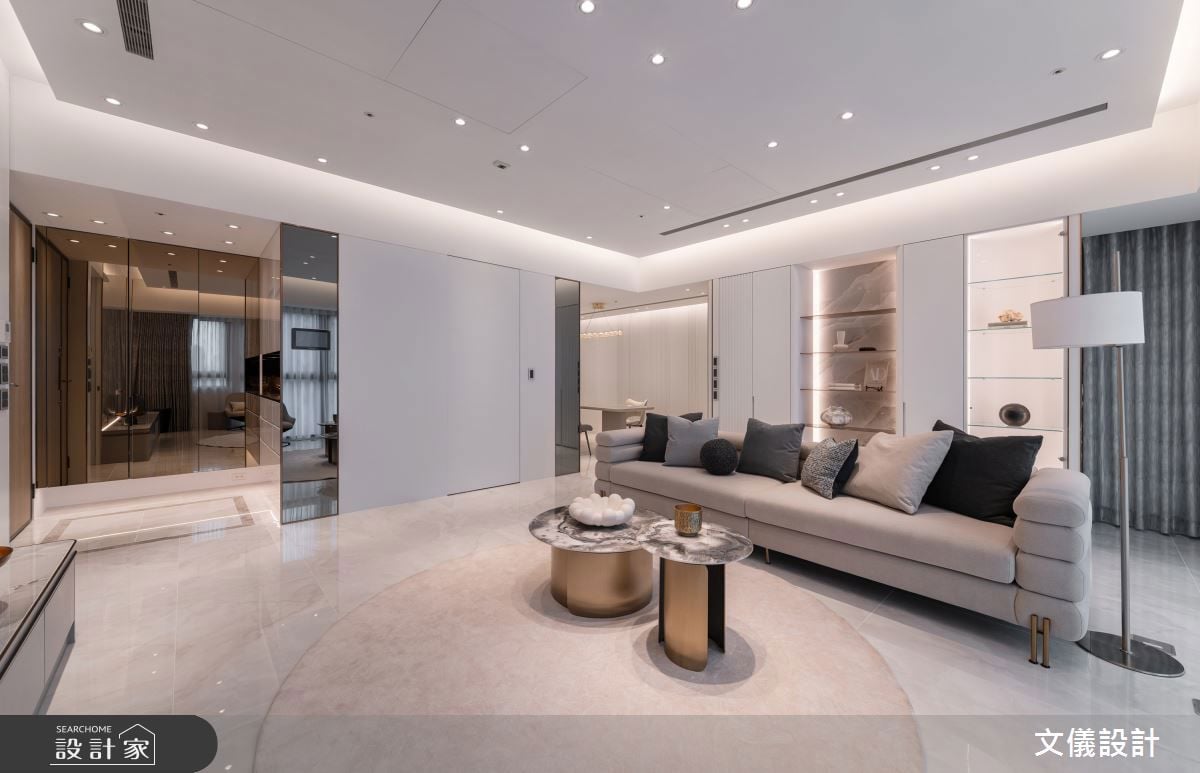 玄關淺色地磚圍塑落塵區,懸浮鏡面櫃體與木質櫃體交錯搭配,增添視覺層次,也滿足大量收納,鏡面方便出門前整裝,也有反射空間放大的效果。公領域以輕淺的色調為基底,搭配溫潤的木質、金屬光澤與大理石紋理,在大面落地窗映照下,塑造出現代明亮、輕奢的質感,玉石電視牆獨一無二的紋理和色彩,展現自然之美,挹注藝術氣息,型塑居家端景牆,沙發後方收納櫃以鍍鈦金屬為層板,鑲嵌燈帶,宛若精品櫥窗,突顯屋主的收藏與品味。餐廳與廚房透過訂製拉門區隔,劃分為內廚熱炒區與中島輕食區,餐廳結合中島,型塑回字型動線,星菱玻璃與璀璨水晶燈折射,呈現玉石紋的光影,烘托出高雅不凡的氛圍,不論用餐或宴客,都增添了獨特的低調雅緻與雋永趣味,每一次相聚,都成為美好的回憶。