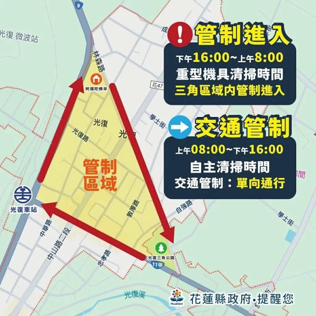 根據花蓮縣政府公告,光復鄉市區道路管制分為兩個時段,上午8時至下午4時為自主清掃時段,採單向通行;下午4時至隔日上午8時為重型機具清掃時段,全面禁止進入。台9線與林森路、中正路等路口實施單向通行管制。