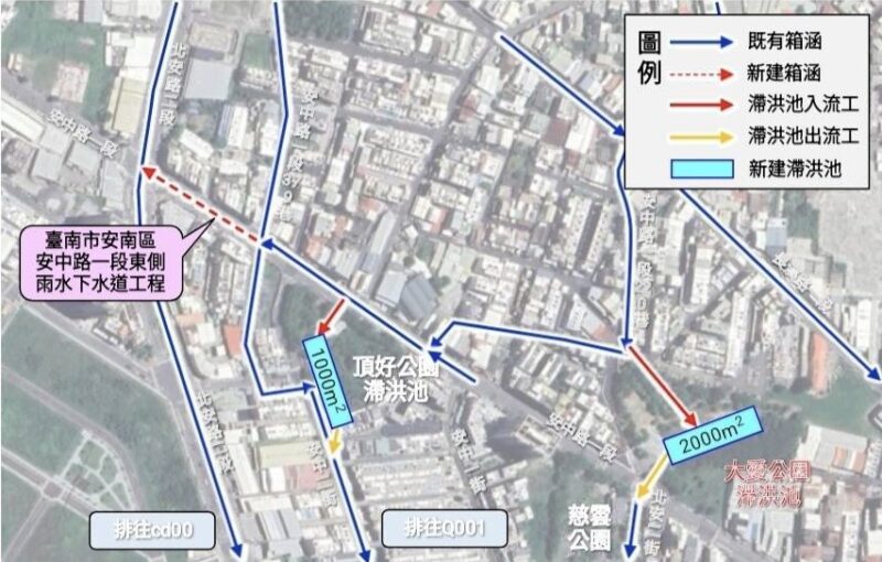 水利局說明,永康區永平街一帶受限於路幅寬度,既有雨水下水道難以大規模擴建,為突破工程瓶頸,市府以治水新思維「逕流分擔」治理改善,規劃將永康「探索教育公園」(公5)及鄰近綠地改造為兼具防洪與休憩功能的滯洪場域,預計將可提供約1.09萬噸滯洪空間,大幅提升地區防洪韌性。另外針對安南區安中路一段周邊,水利局將利用頂好公園及大愛公園腹地設置地下滯洪池,預計可增加9,000噸滯洪空間,將有效分擔安中路一段鄰近集水區逕流量,降低周邊淹水潛勢。