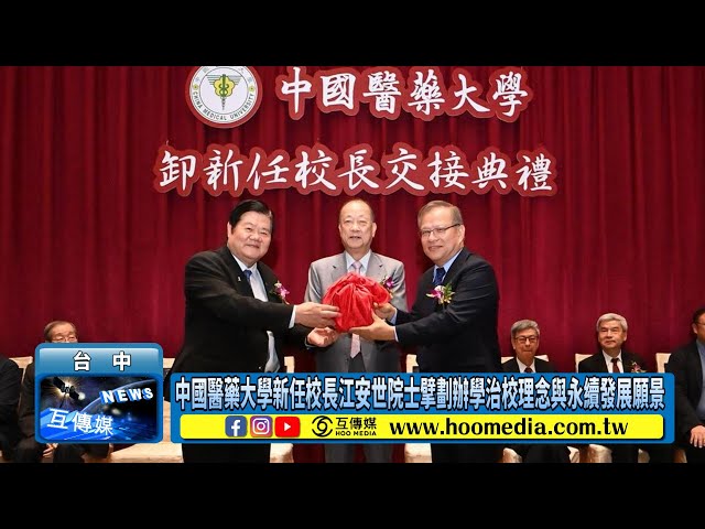 【互傳媒/記者 張玉泰/台中 報導】中國醫藥大學卸新任校長交接典禮今(1)日在水湳校區隆重舉行,新任校長是國際知名的生物學家江安世院士;蔡長海董事長主持卸新任校長監交時,代表董事會感謝卸任的洪明奇校長任內致力推動校務發展的貢獻;同時歡迎新任校長江安世院士,相信以他卓越的學術成就與豐富的行政經驗及卓越的領導力與國際視野,必能帶領中國醫藥大學持續的發展與進步,一定可以讓本校繼續邁向新的高峰。
