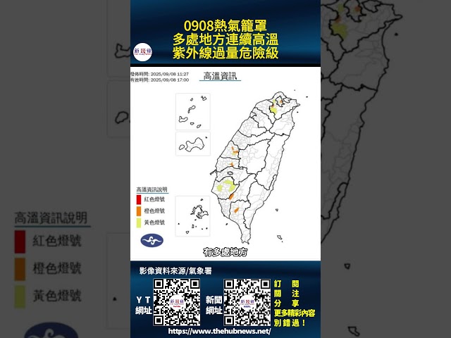 今天9月8日各地持續高溫炎熱,白天臺北市、新北市、彰化縣、雲林縣、高雄市、屏東縣,有連續3天36度以上高溫的機率;臺南市亦有36度以上的高溫。請注意避免非必要的戶外活動,做好防曬、多補充水份、慎防熱傷害。有多處地方出現過量級和危險級的紫外線指數,請注意。