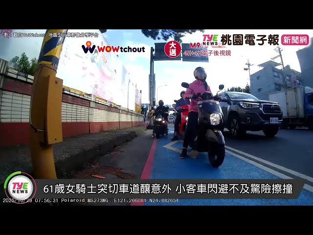 本文章來自《桃園電子報》。原文:【有片】61歲女騎士突切車道釀意外 小客車閃避不及驚險擦撞
