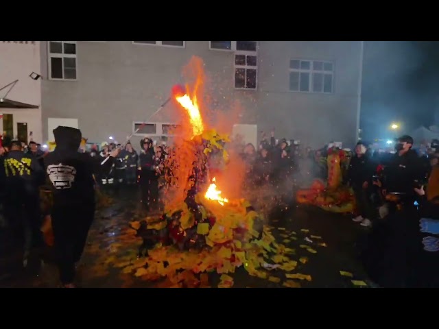 當夜色漸沉,祥龍在鑼鼓聲中緩緩集結,完成最後一次巡行。龍身在燈火映照下熠熠生輝,彷彿將連日來的掌聲、讚嘆與祝福盡數收納於身。隨著余文忠市長恭讀奏疏、眾人合十祝禱,儀式莊嚴展開。當奏章化為火光,龍隊恭敬接引聖火,隨即展開肅穆的「化龍」儀式。龍首昂揚、龍身盤旋,在煙霧與火光中緩緩騰起,象徵功成圓滿、返天復命。那一刻,龍煙在夜空中若隱若現,彷彿由實轉虛、由動入靜,為整個火旁龍盛會畫下神聖而莊嚴的句點。